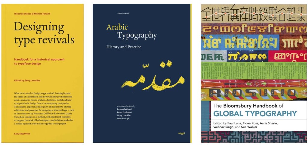 Notable recent projects include TypoArabic (and the main output from that project, Arabic Typography: History and Practice), and Women in Type, while research-informed practical outputs include the Gulzar font and the typefaces for the Murty Classical Library of India. Notable recent books include Designing Type Revivals, and the Bloomsbury Handbook of Global Typography, published in spring of 2026.